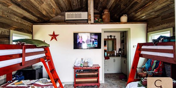 The Bunkhouse is just across the yard from the Antique House and Schoolhouse. It comfortably sleeps 6 adults with two sets of twin over full bed bunk-beds. It has a spacious bathroom that features double sinks and a beautiful shower. The bunkhouse has a coffee pot, microwave, small refrigerator and basic dishes. There is a great outdoor sitting area and gas fire pit out front.